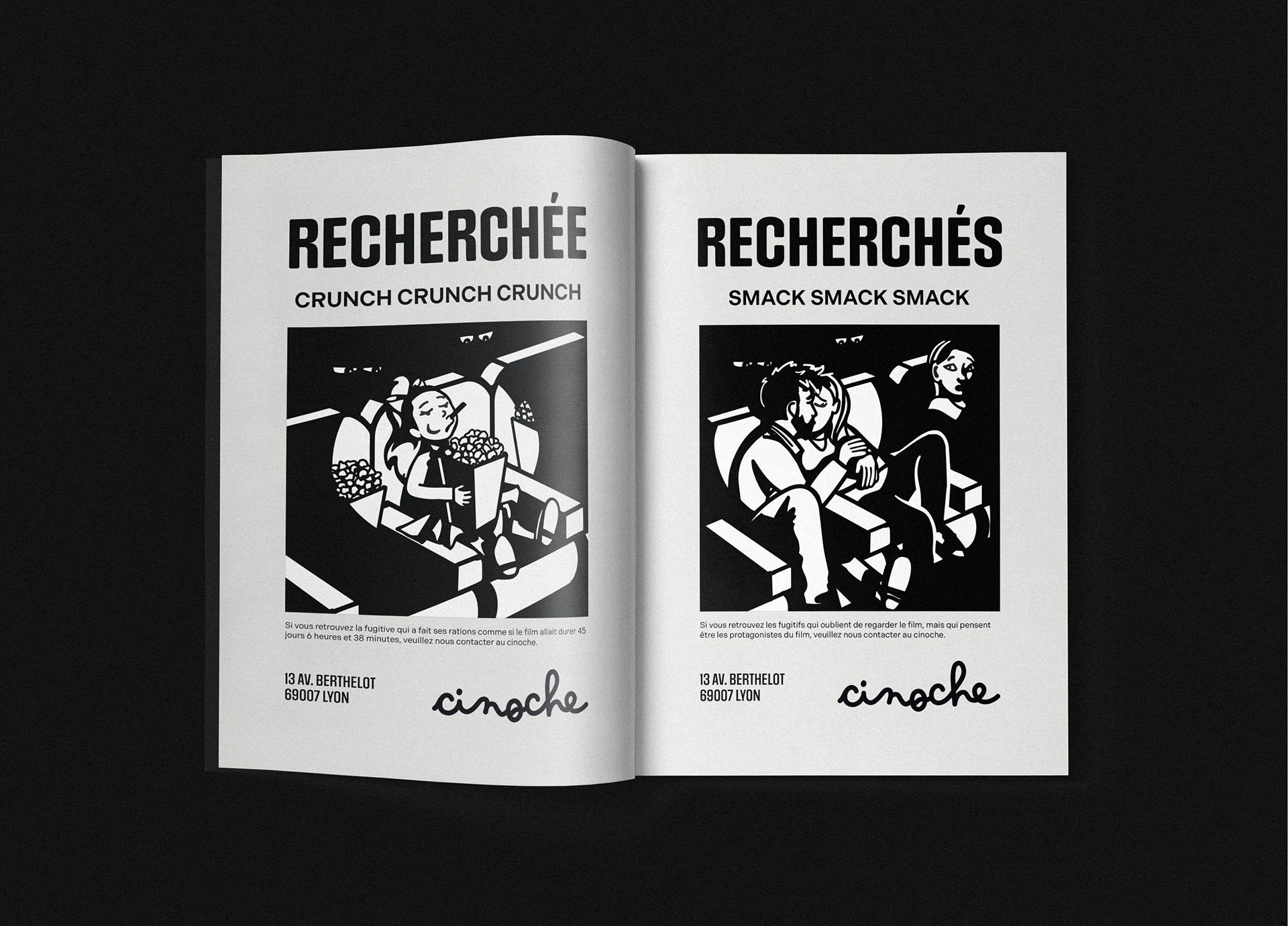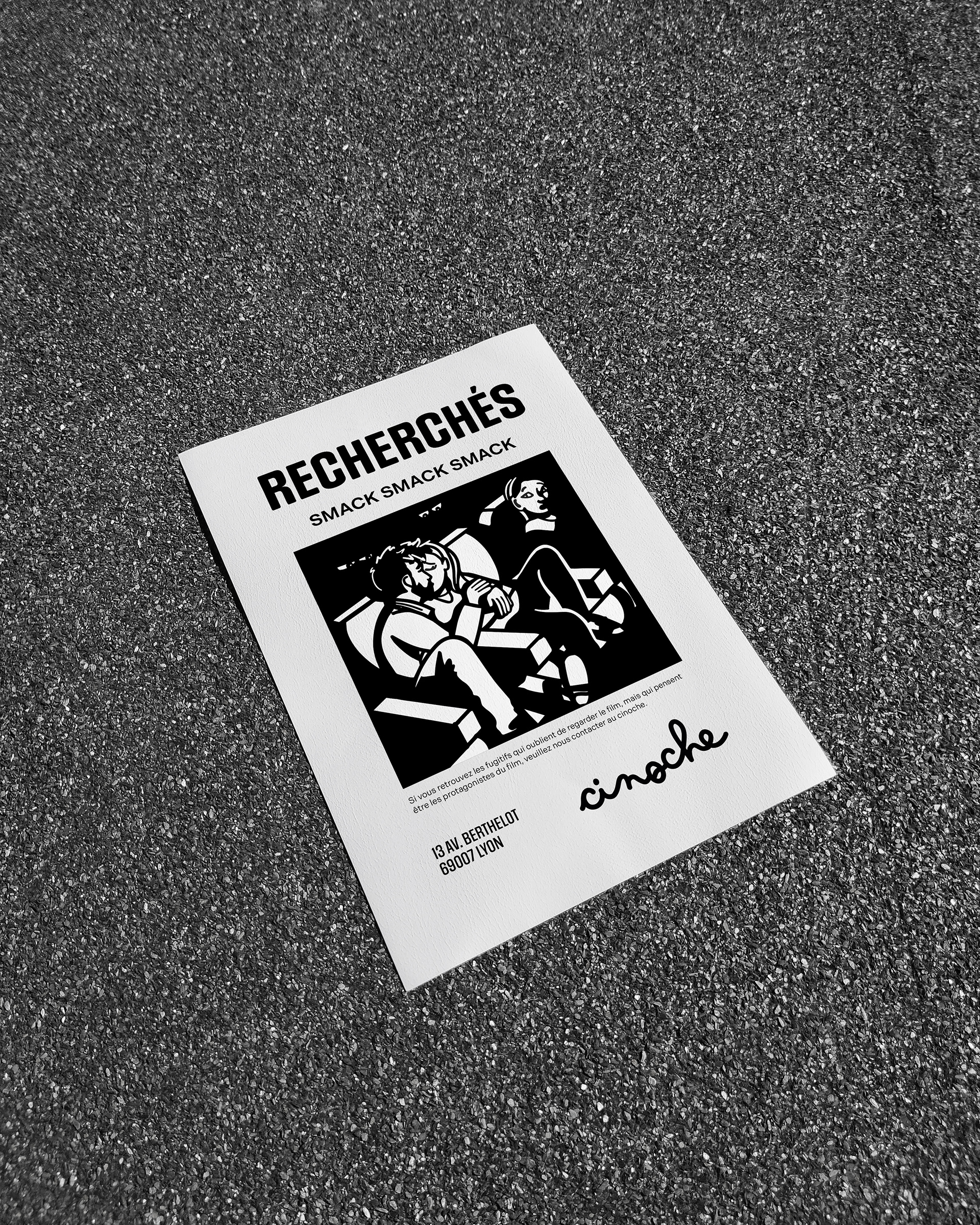 For this two-person team project, we had to redesign Lyon's iconic cinema, the Comoedia. It's an independent, fairly traditional cinema. We decided to make it edgier, offbeat, humorous, trying to make it unique and stand out from other cinematic experiences. We wanted something simple and memorable. That's why we decided to call it "Cinoche," which is a casual, informal way of saying "cinema." Cinoche is a place where everyone comes together. Children, adults, seniors—everyone is there, regardless of their social background, because Cinoche is accessible and aims to share culture without the elitist and biased image of cinephiles. We're getting straight to the point; it's simply "Cinoche."